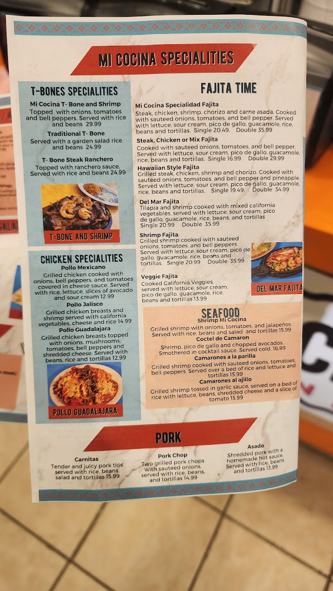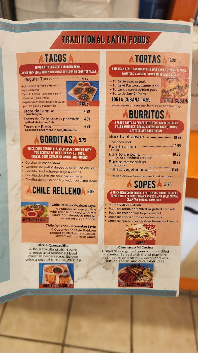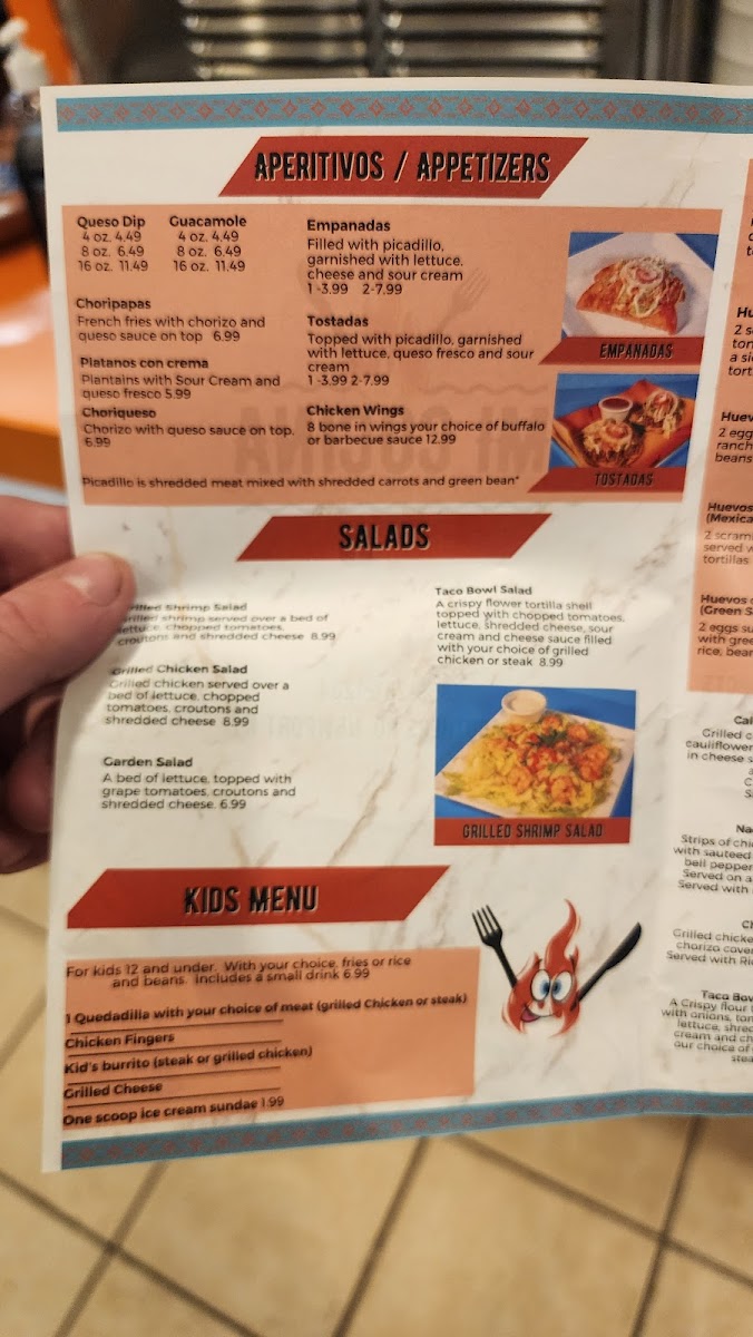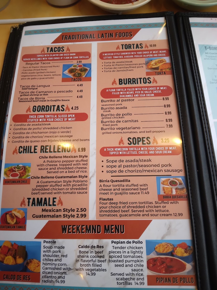 Fiesta Cocina Latín Restaurant’s menu offers a vibrant and satisfying selection that caters to all tastes, from hearty traditional dishes to kid-friendly favorites. The Kids Menu features approachable options like Chicken Fingers, 1 Quesadilla With Your Choice Of Meat, Grilled Cheese, Kid's Burrito, and a sweet finish with One Scoop Ice Cream Sundae. For torta lovers, choices include Torta De Jamón / Ham, Torta Al Pastor / Seasoned Pork, Tortas De Carnitas / Fried Pork, Torta Cubana, and Torta De Asada / Steak, each packed with authentic flavors. The Fajita Time section delights with Shrimp Fajita, Veggie Fajita, Mi Cocina Especialidad Fajita, Del Mar Fajita, and Hawaiian Style Fajita, while fresh options like Grilled Chicken Salad, Taco Bowl Salad, Garden Salad, and Grilled Shrimp Salad satisfy lighter appetites. Appetizers such as Guacamole, Choriqueso, Tostadas, Queso Dip, and Platanos Con Crema set the stage for meals rich in flavor. The menu also showcases Chile Relleno Guatemalan Style and Chile Relleno Mexican Style, alongside chicken specialties like Pollo Mexicano, Pollo Guadalajara, and Pollo Jalisco. Taco enthusiasts will appreciate Tacos De Lengua, Regular Tacos, Tacos De Camaron O Pescado, and Tacos De Birria, complemented by hearty Gorditas such as Gordita De Queso Con Frijoles / Cheese And Beans, Gordita De Asada / Steak, Gordita De Chorizo / Mexican Sausage, Gorditas De Pollo / Shredded Or Grilled Chicken, and Gordita De Chicharron (Rojo O Verde). Side dishes like Rice And Beans, Fries, Shredded Cheese Rice, and Tortillas round out the meal, while desserts including Chimi Cheesecake, Flan, Churros, and Chocoflan offer indulgent finales. Seafood selections such as Camarones Al Ajillo, Coctel De Camaron, Shrimp Mi Cocina, and Camarones A La Parilla bring coastal flair, and traditional Latin dishes like Taco Bowl Fajita Salad, Churrasco Mi Cocina, Huevos Rancheros, Huevos Con Chorizo (Mexican Sausage), and Chimichanga highlight comforting classics. T-Bone enthusiasts are treated to T-Bone Steak Ranchero, Mi Cocina T-Bone And Shrimp, and Traditional T-Bone, while pork lovers can savor Pork Chop, Asado, and Carnitas. To accompany any meal, the drink selection includes Jarritos, Virgin Daiquiri, Pepsi Products, Juices, and Coffee, making Fiesta Cocina Latín Restaurant a place where every dish feels thoughtfully crafted and full of personality.