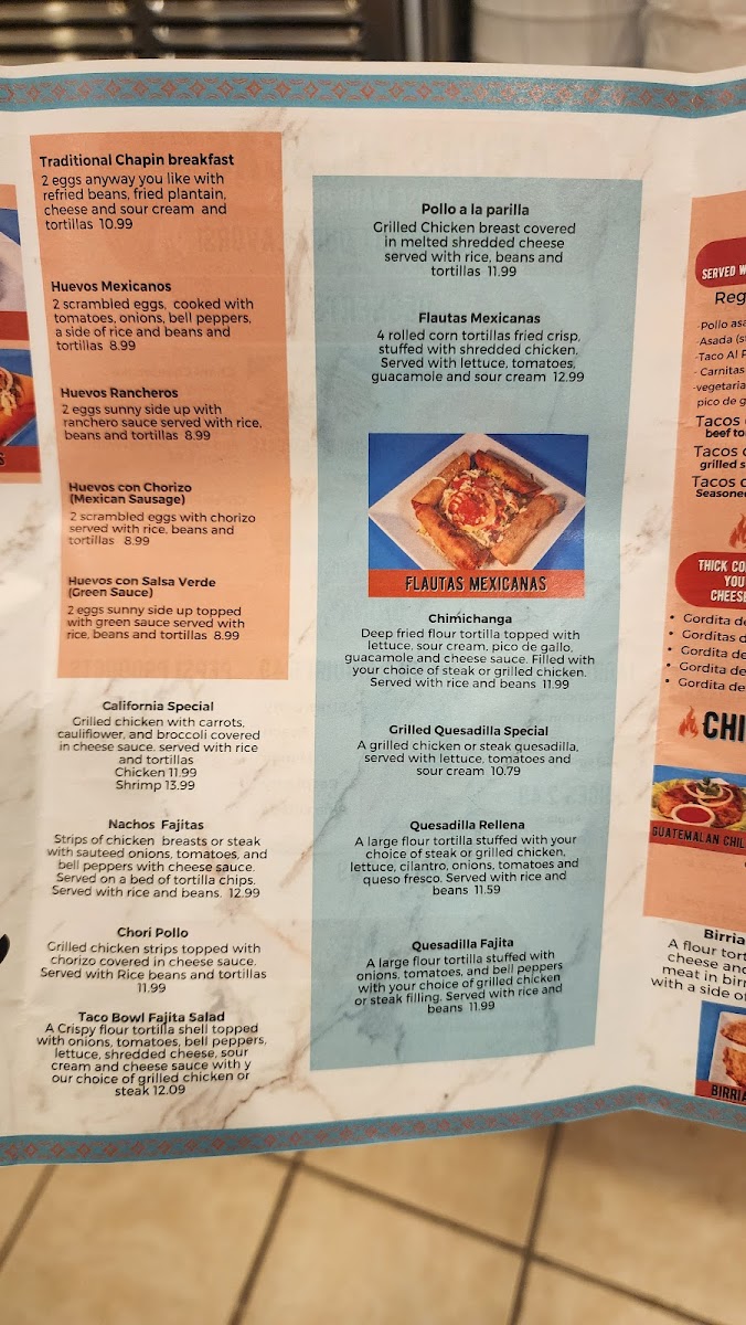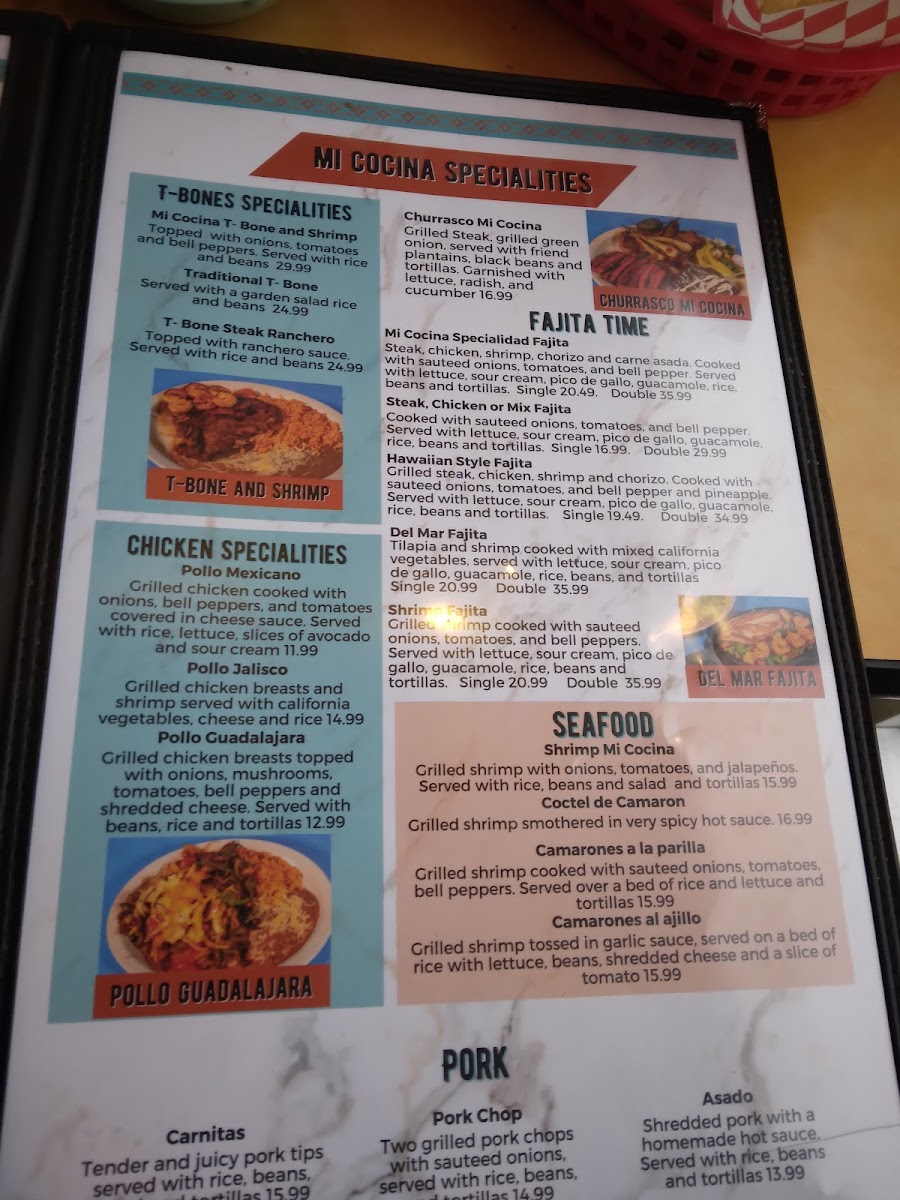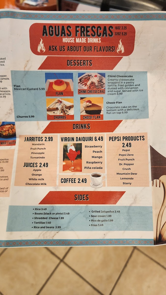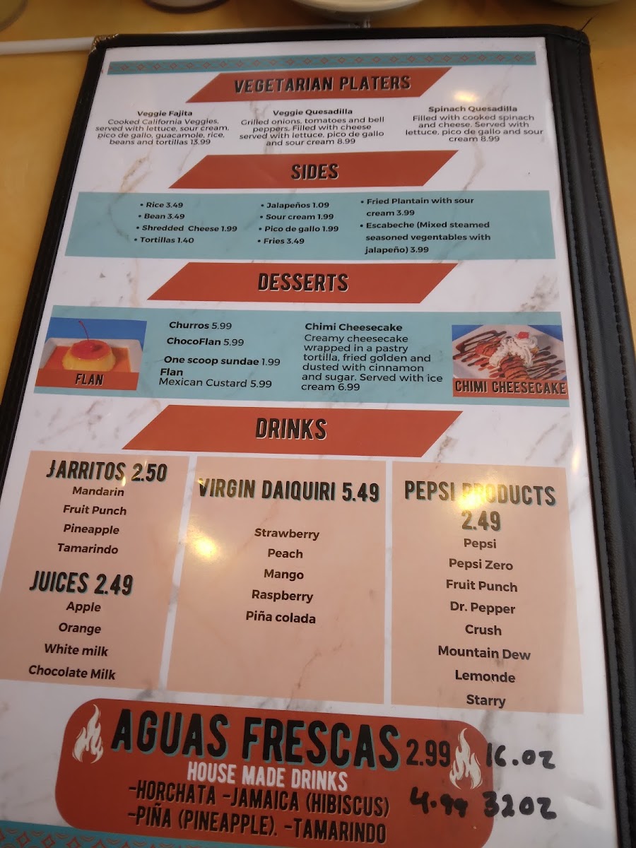 Fiesta Cocina Latín Restaurant’s menu offers a vibrant and satisfying selection that caters to all tastes, from hearty traditional dishes to kid-friendly favorites. The Kids Menu features approachable options like Chicken Fingers, 1 Quesadilla With Your Choice Of Meat, Grilled Cheese, Kid's Burrito, and a sweet finish with One Scoop Ice Cream Sundae. For torta lovers, choices include Torta De Jamón / Ham, Torta Al Pastor / Seasoned Pork, Tortas De Carnitas / Fried Pork, Torta Cubana, and Torta De Asada / Steak, each packed with authentic flavors. The Fajita Time section delights with Shrimp Fajita, Veggie Fajita, Mi Cocina Especialidad Fajita, Del Mar Fajita, and Hawaiian Style Fajita, while fresh options like Grilled Chicken Salad, Taco Bowl Salad, Garden Salad, and Grilled Shrimp Salad satisfy lighter appetites. Appetizers such as Guacamole, Choriqueso, Tostadas, Queso Dip, and Platanos Con Crema set the stage for meals rich in flavor. The menu also showcases Chile Relleno Guatemalan Style and Chile Relleno Mexican Style, alongside chicken specialties like Pollo Mexicano, Pollo Guadalajara, and Pollo Jalisco. Taco enthusiasts will appreciate Tacos De Lengua, Regular Tacos, Tacos De Camaron O Pescado, and Tacos De Birria, complemented by hearty Gorditas such as Gordita De Queso Con Frijoles / Cheese And Beans, Gordita De Asada / Steak, Gordita De Chorizo / Mexican Sausage, Gorditas De Pollo / Shredded Or Grilled Chicken, and Gordita De Chicharron (Rojo O Verde). Side dishes like Rice And Beans, Fries, Shredded Cheese Rice, and Tortillas round out the meal, while desserts including Chimi Cheesecake, Flan, Churros, and Chocoflan offer indulgent finales. Seafood selections such as Camarones Al Ajillo, Coctel De Camaron, Shrimp Mi Cocina, and Camarones A La Parilla bring coastal flair, and traditional Latin dishes like Taco Bowl Fajita Salad, Churrasco Mi Cocina, Huevos Rancheros, Huevos Con Chorizo (Mexican Sausage), and Chimichanga highlight comforting classics. T-Bone enthusiasts are treated to T-Bone Steak Ranchero, Mi Cocina T-Bone And Shrimp, and Traditional T-Bone, while pork lovers can savor Pork Chop, Asado, and Carnitas. To accompany any meal, the drink selection includes Jarritos, Virgin Daiquiri, Pepsi Products, Juices, and Coffee, making Fiesta Cocina Latín Restaurant a place where every dish feels thoughtfully crafted and full of personality.